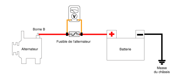 "B" de l'alternateur et le câble de plomb (-) du voltmètre